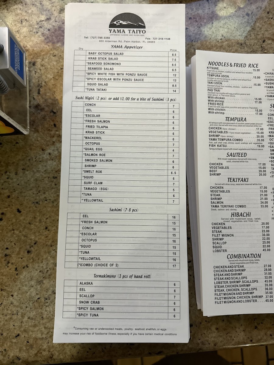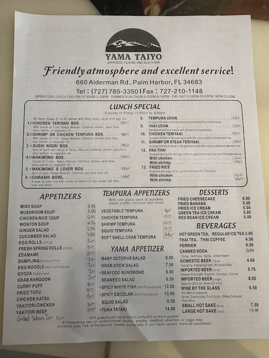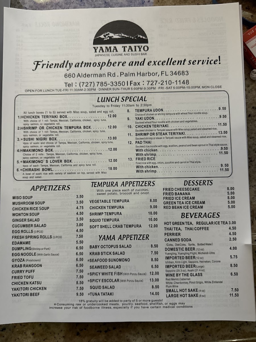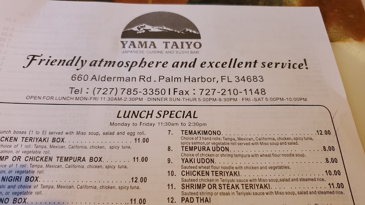 If you’re in the mood for fresh, flavorful Japanese cuisine, you have to check out the Yama-Taiyo Japanese Cuisine Menu. Located at 660 Alderman Rd, Palm Harbor, FL, this spot offers a mouthwatering variety of dishes, from sushi rolls that are as beautiful as they are tasty, to sizzling hot bowls of ramen packed with savory broth. Each dish is crafted with care, bringing the authentic taste of Japan straight to your table. Whether you’re a sushi enthusiast or a fan of comforting noodle soups, there’s something here to satisfy every craving. With a menu that caters to all tastes, Yama-Taiyo is the perfect place to enjoy a meal with friends or family.